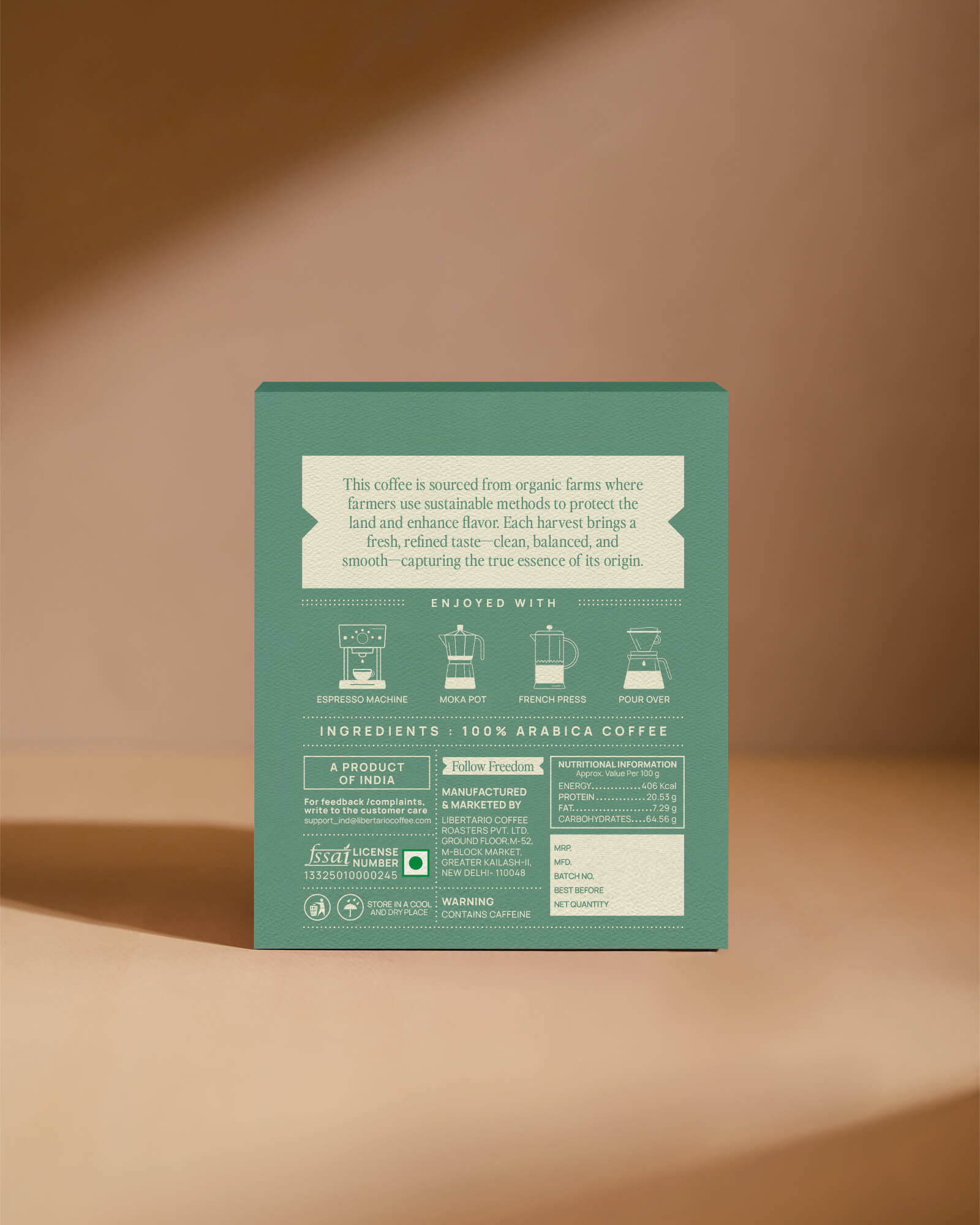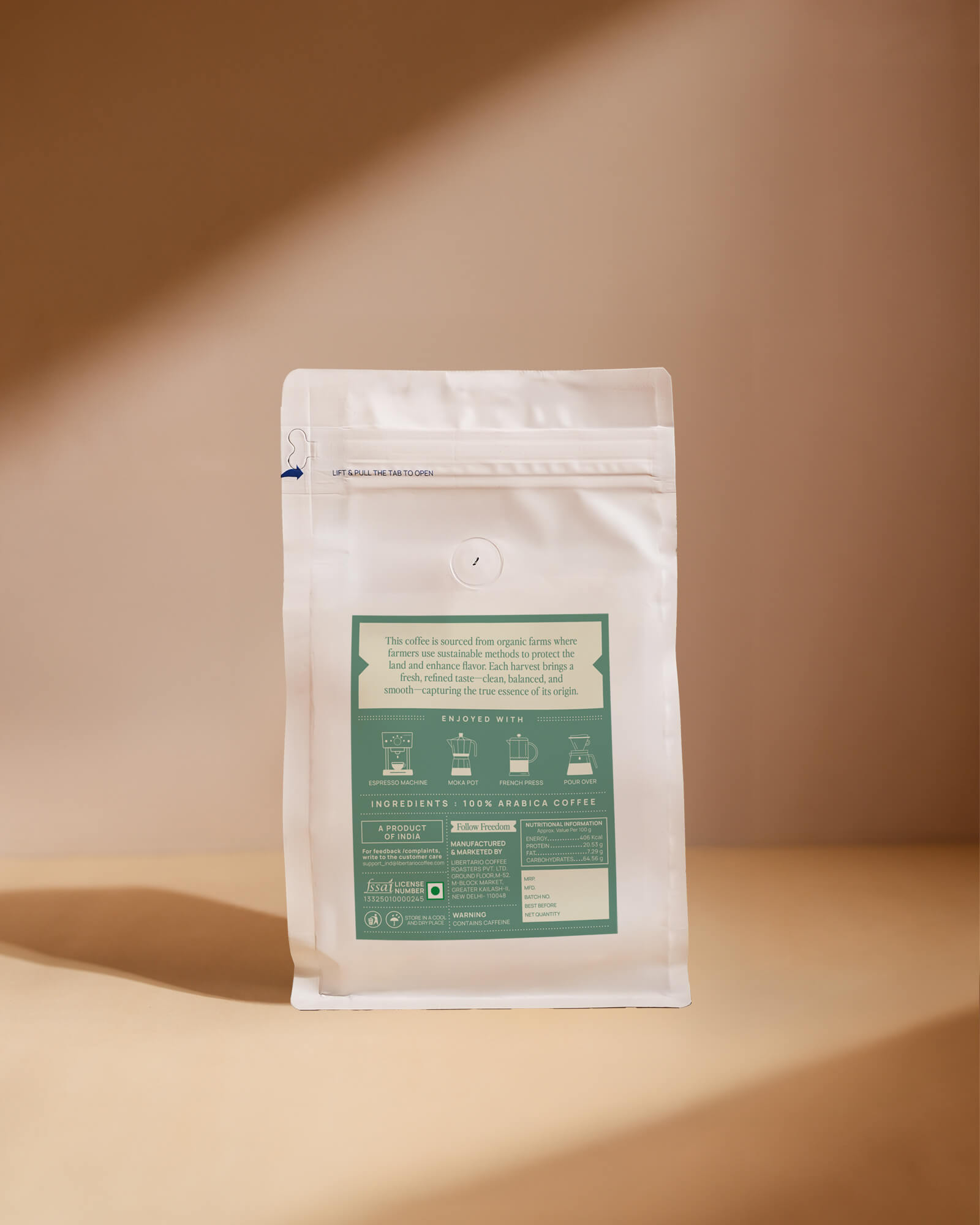 This coffee is sourced from organic farms where farmers use sustainable methods to protect the land and enhance flavor. Each harvest brings a fresh, refined taste--clean, balanced, and smooth- capturing the true essence of its origin.