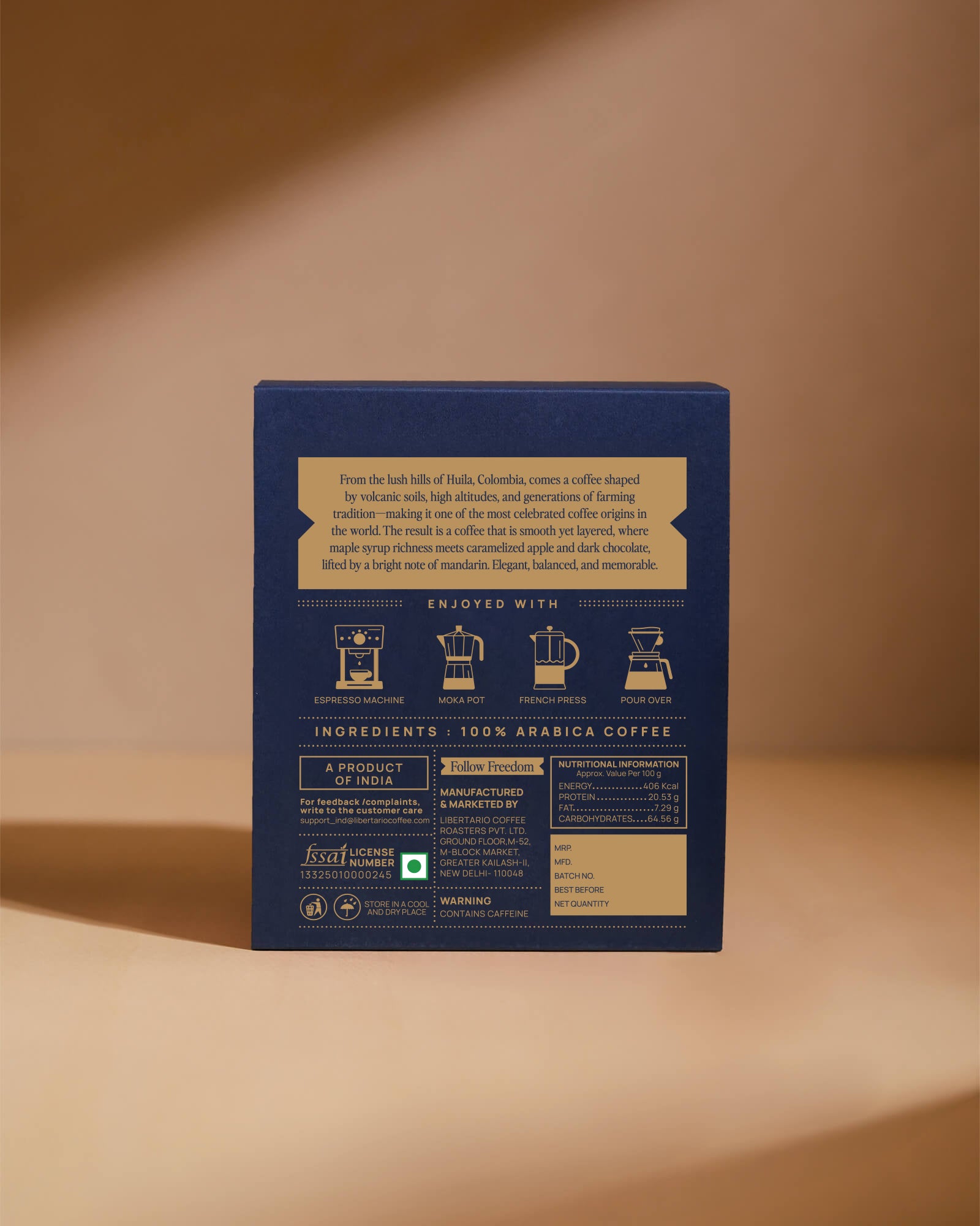 From the lush hills of Huila, Colombia, comes a coffee shaped by volcanic soils, high altitudes, and generations of farming tradition making it one of the most celebrated coffee origins in the world. The result is a coffee that is smooth yet layered, where maple syrup richness meets caramelized apple and dark chocolate, lifted by a bright note of mandarin. Elegant, balanced, and memorable.