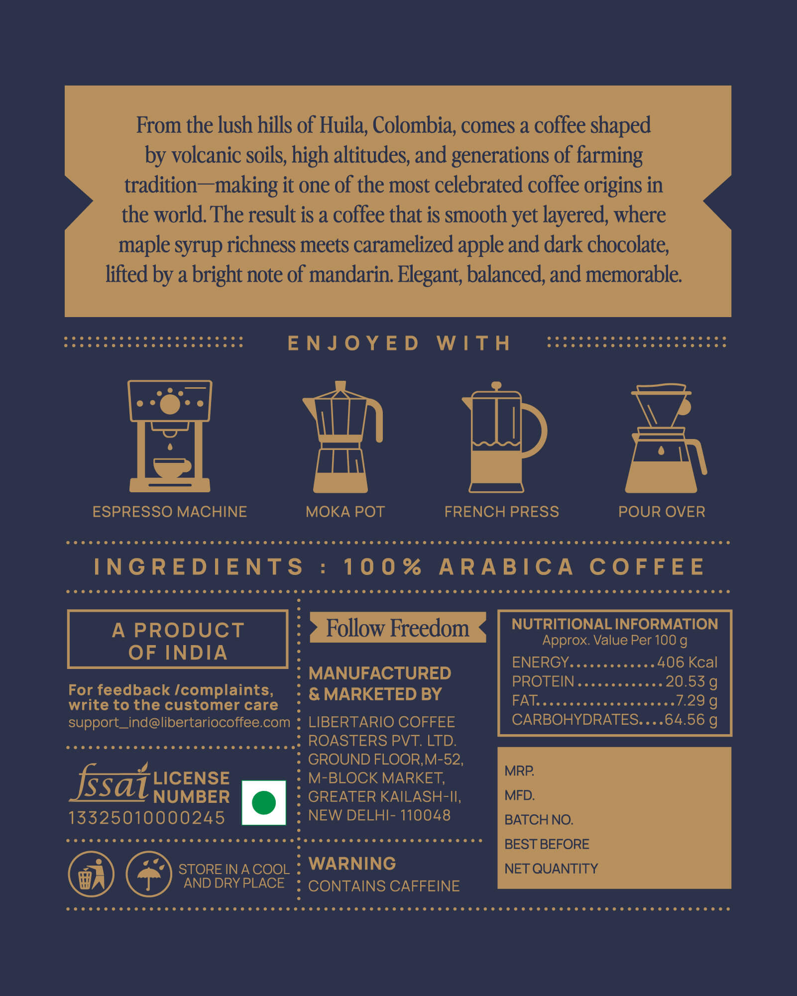 Introducing our Icon Series: Rare Editions. From the lush hills of Huila, Colombia, comes a coffee shaped by volcanic soils, high altitudes, and generations of farming tradition—making it one of the most celebrated coffee origins in the world. The result is a cup that is smooth yet layered, where maple syrup richness meets caramelized apple and dark chocolate, lifted by a bright note of mandarin. Elegant, balanced, and memorable.