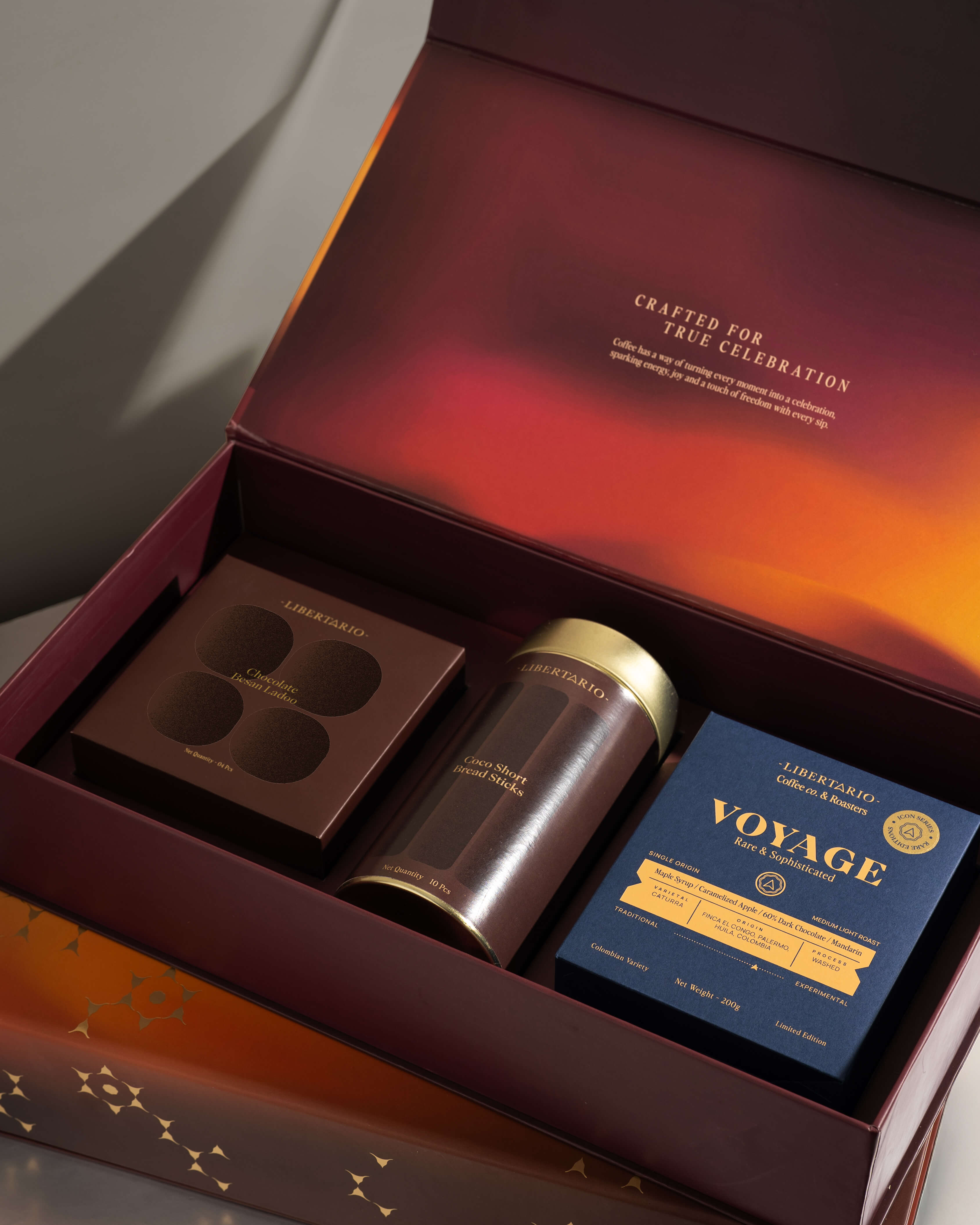 This box contains: 200gm Voyage Single Origin, 10 choco breadsticks, and 4 chocolate besan ladoos.